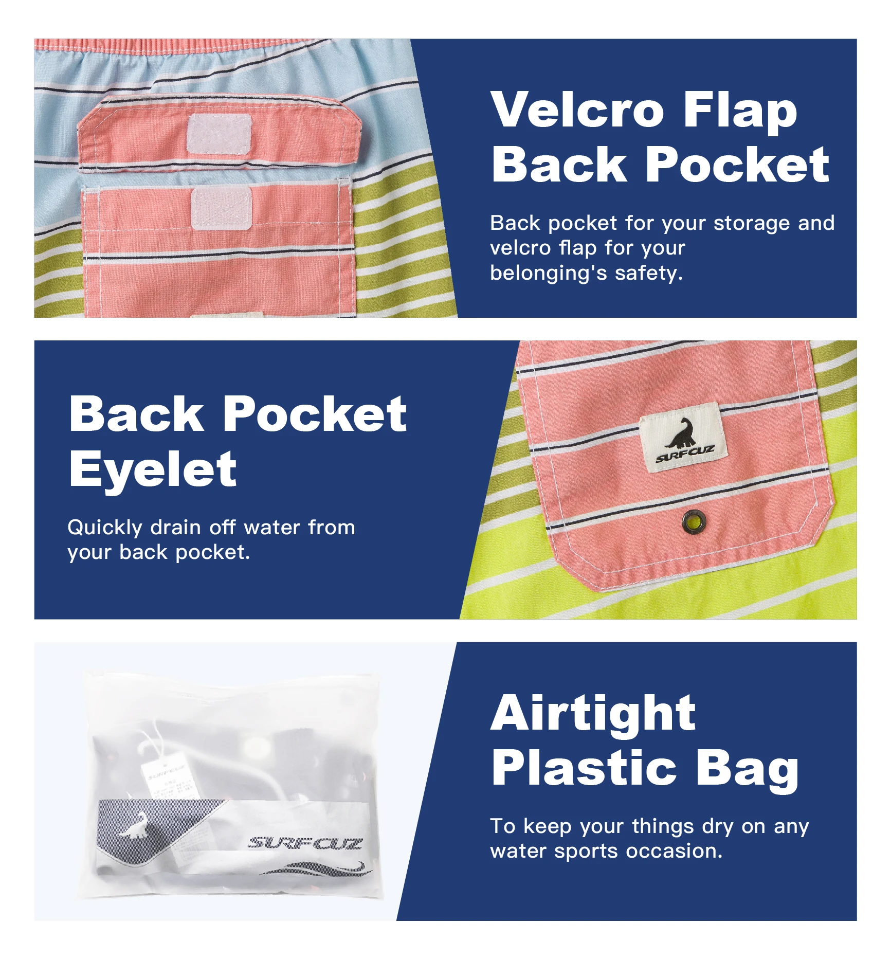 3.Thoughtful design with mesh lining and three pockets. With two pockets on each side and one more backside pocket, you'll enjoy the safe and relaxe feeling when you dress this mens swim trunk.